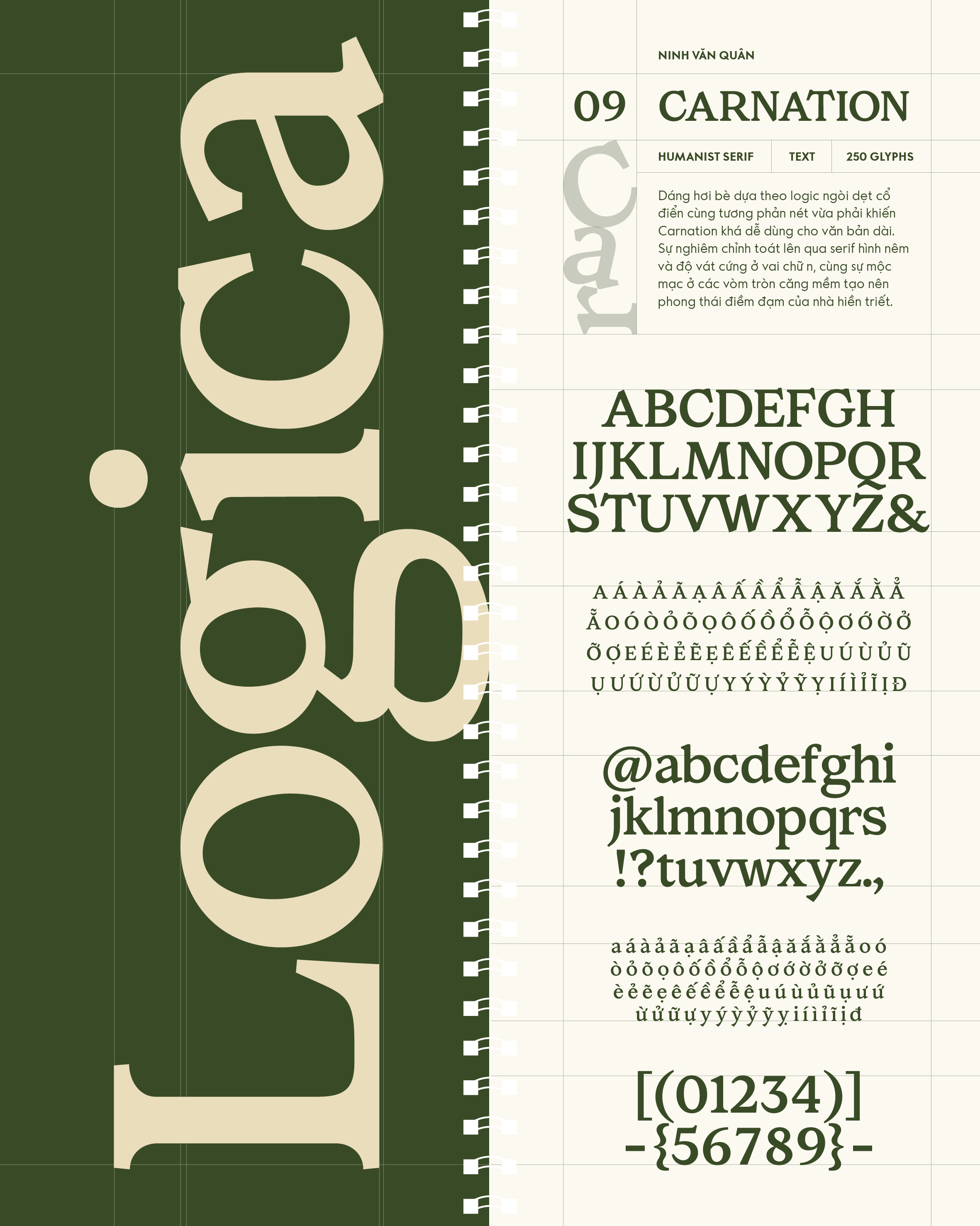 Về Carnation: Dáng hơi bè dựa theo logic ngòi dẹt cổ điển cùng tương phản nét vừa phải khiến Carnation khá dễ dùng cho văn bản dài. Sự nghiêm chỉnh toát lên qua serif hình nêm và độ vát cứng ở vai chữ n, cùng sự mộc mạc ở các vòm tròn căng mềm tạo nên phong thái điềm đạm của nhà hiền triết.