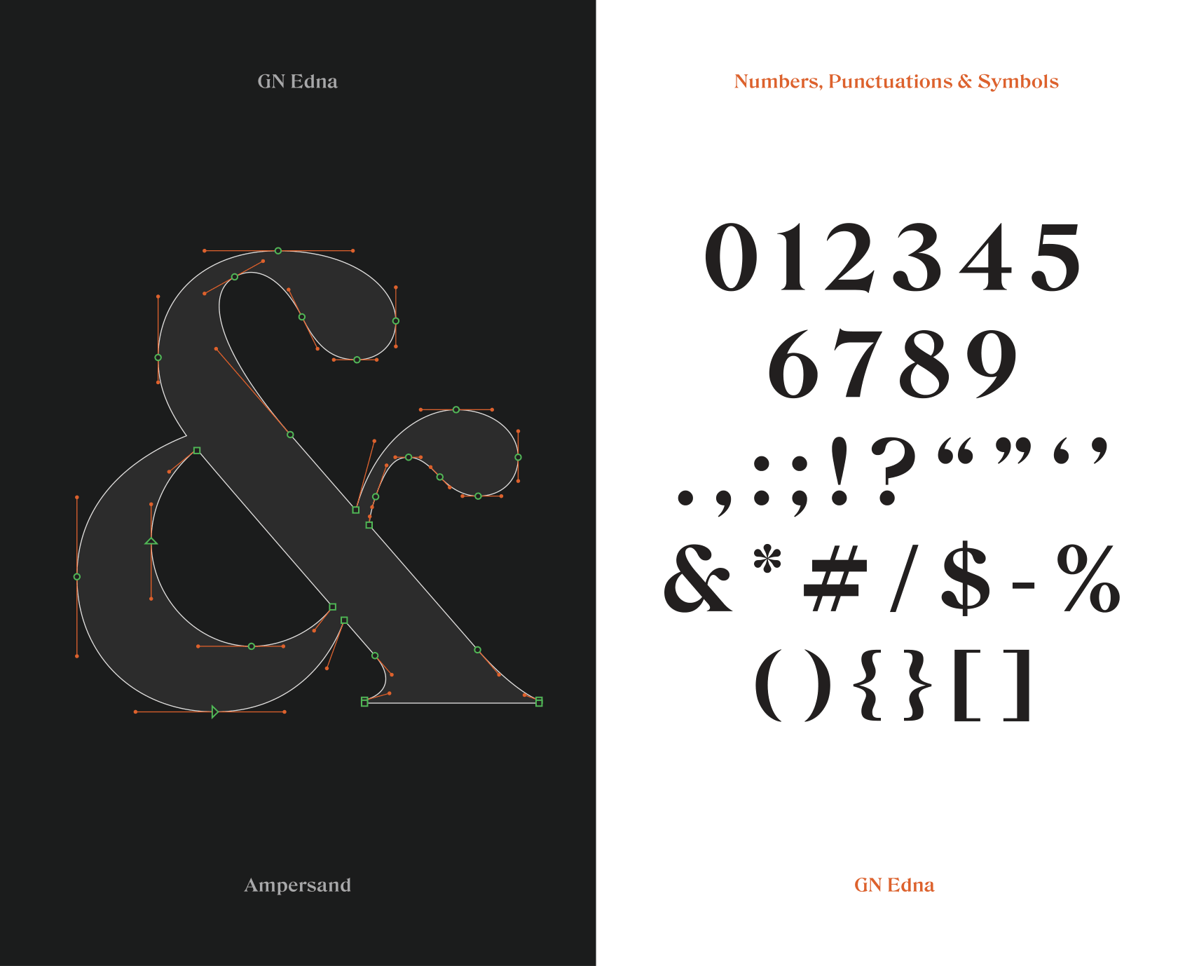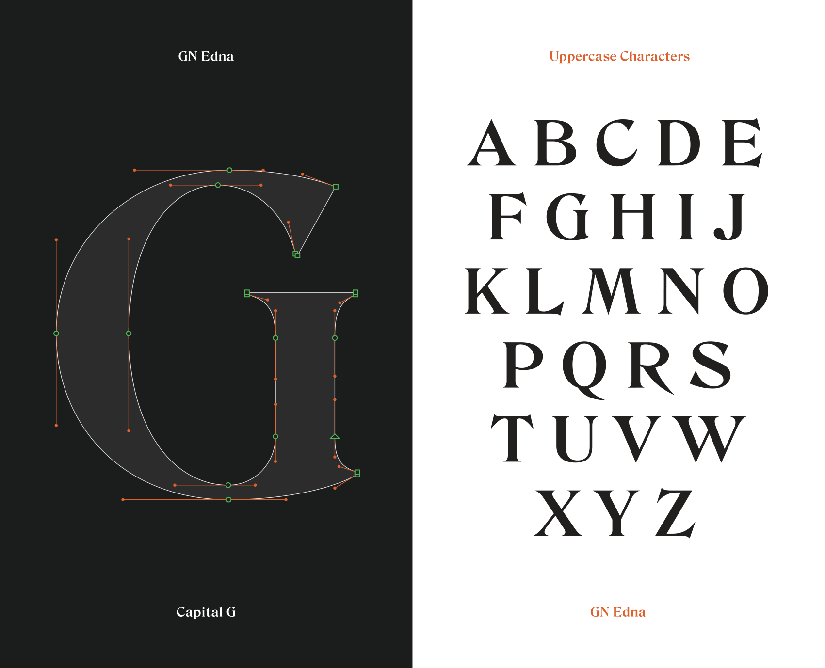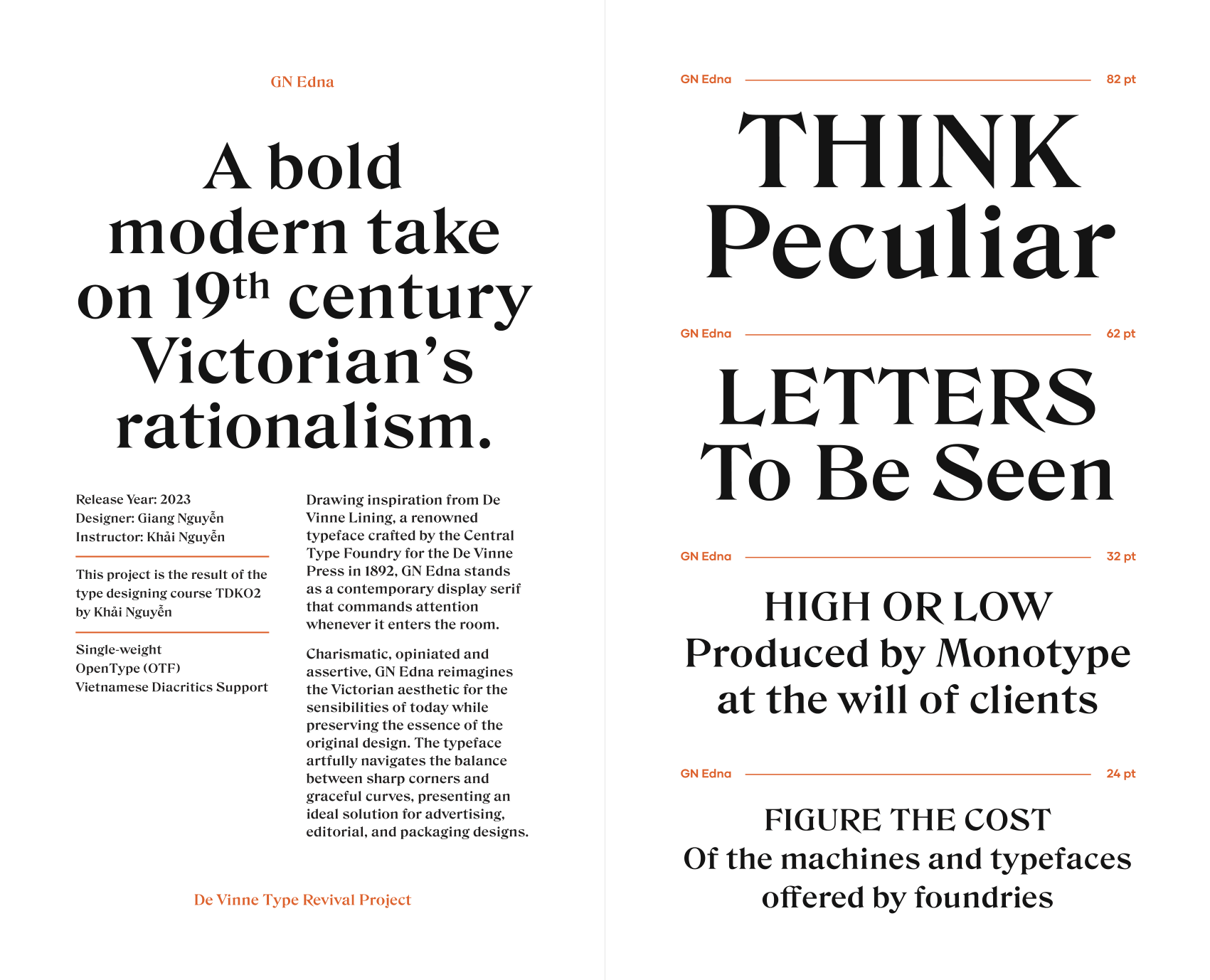 Về GN Edna: Lấy cảm hứng từ De Vinne Lining, một kiểu chữ nổi tiếng được Central Type Foundry thiết kế cho De Vinne Press vào năm 1892, GN Edna là một phông serif chuyên display mang cá tính, quan điểm rõ ràng và đầy quyết đoán. GN Edna tái hiện thẩm mỹ thời Victoria cho cảm quan của hiện tại, đồng thời vẫn giữ được tinh thần của thiết kế nguyên bản. Kiểu chữ này khéo léo cân bằng giữa những góc cạnh sắc nét và các đường cong mềm mại, trở thành lựa chọn lý tưởng cho các thiết kế quảng cáo, biên tập và bao bì.