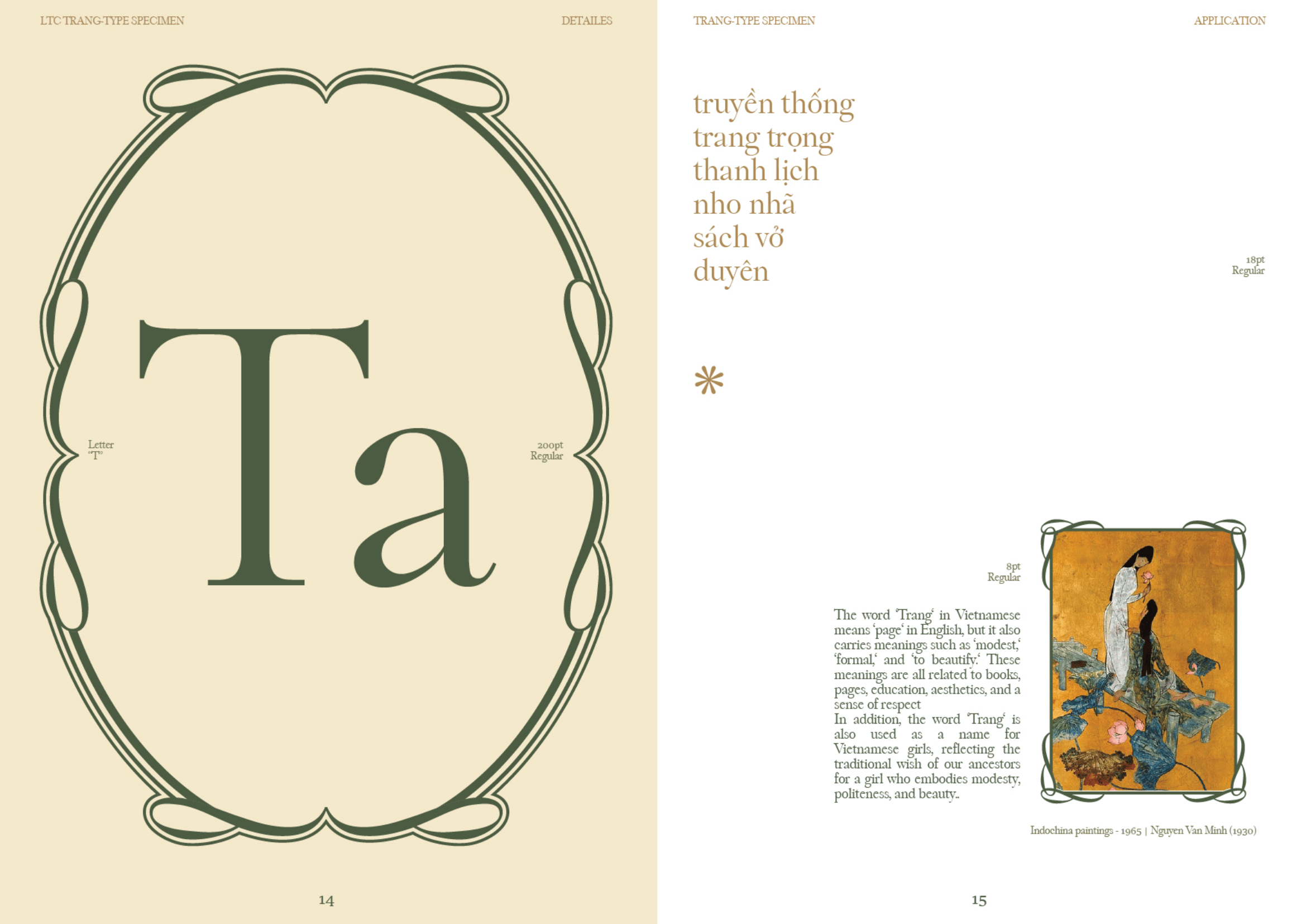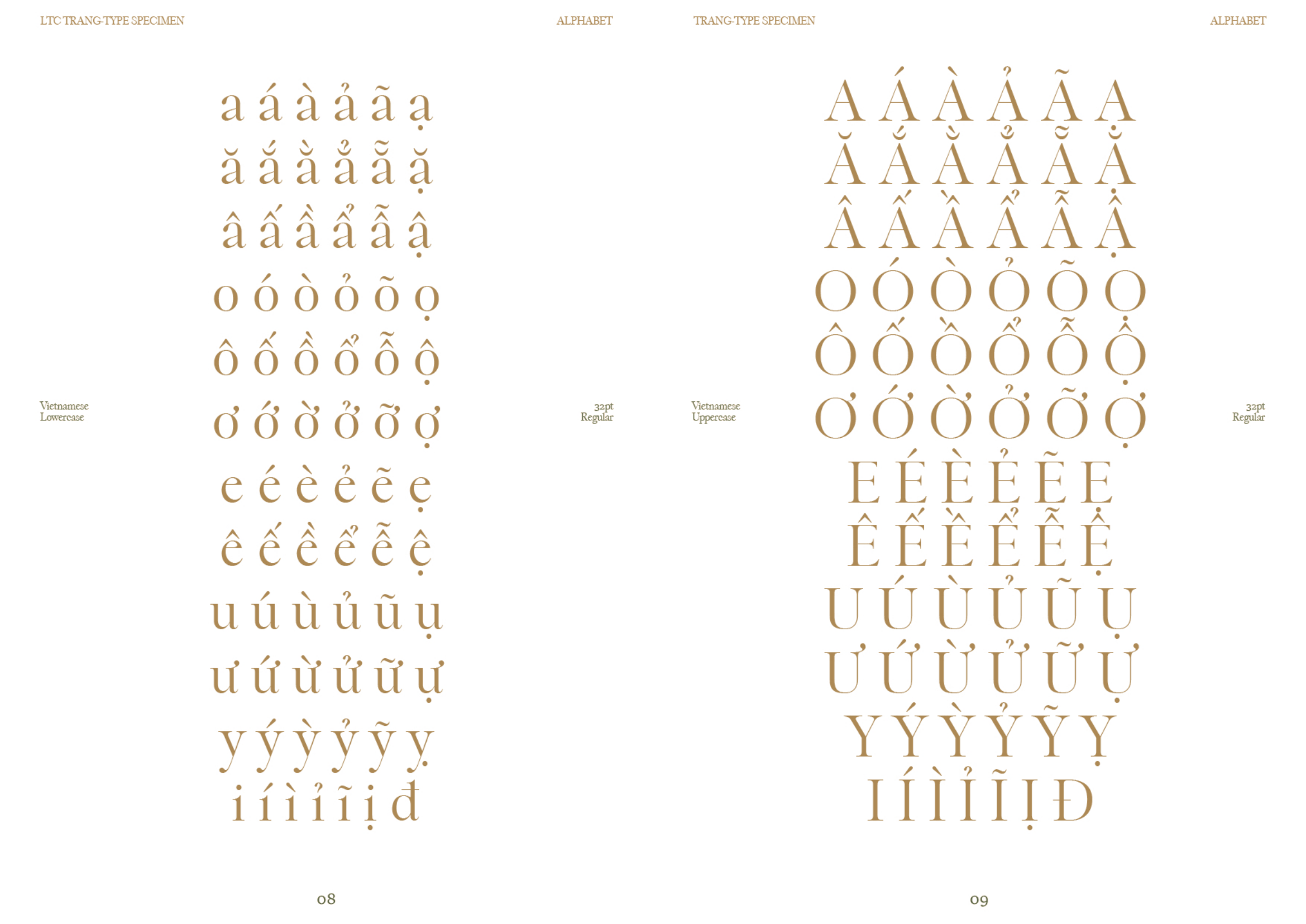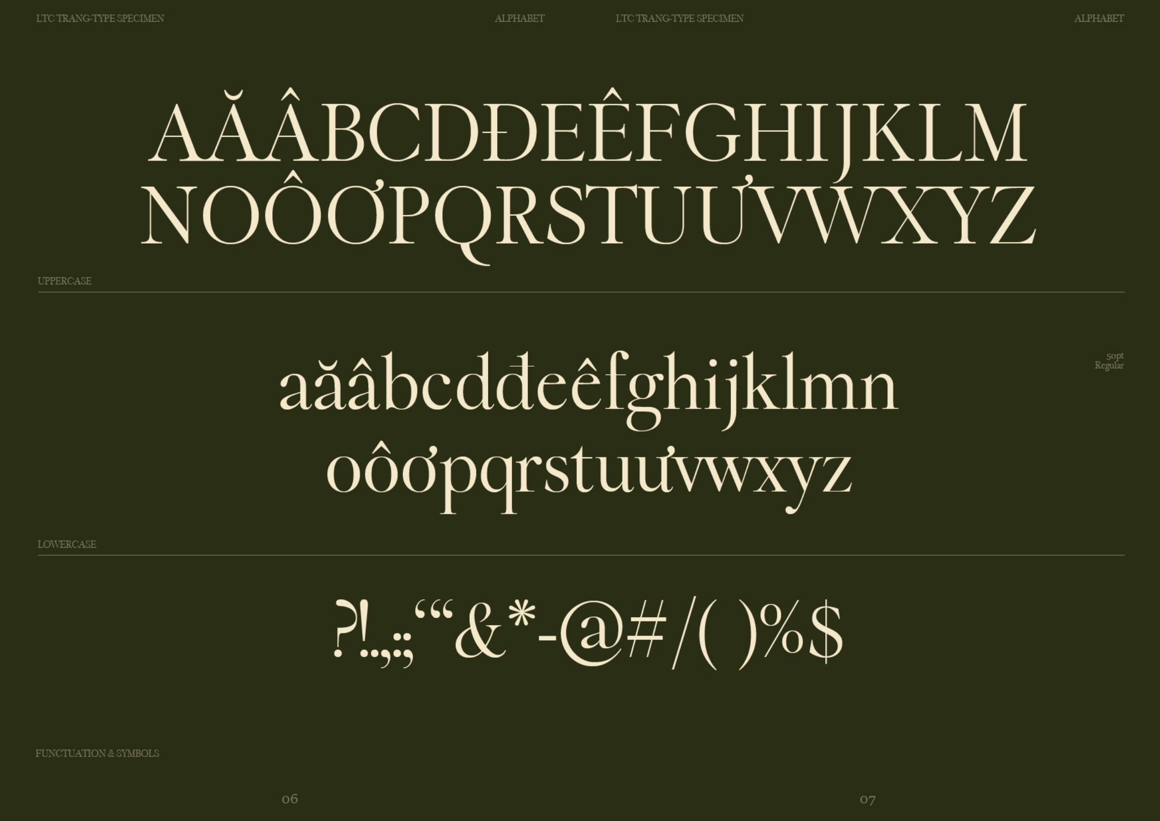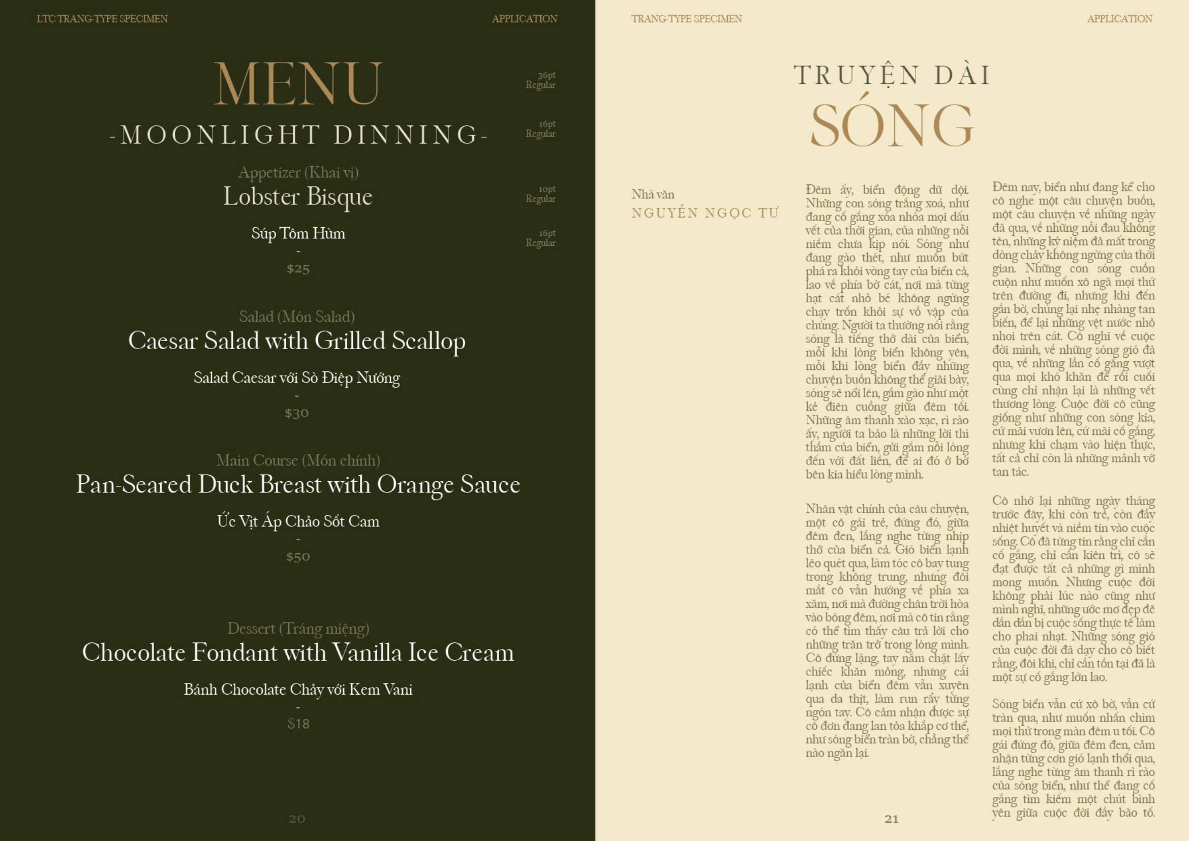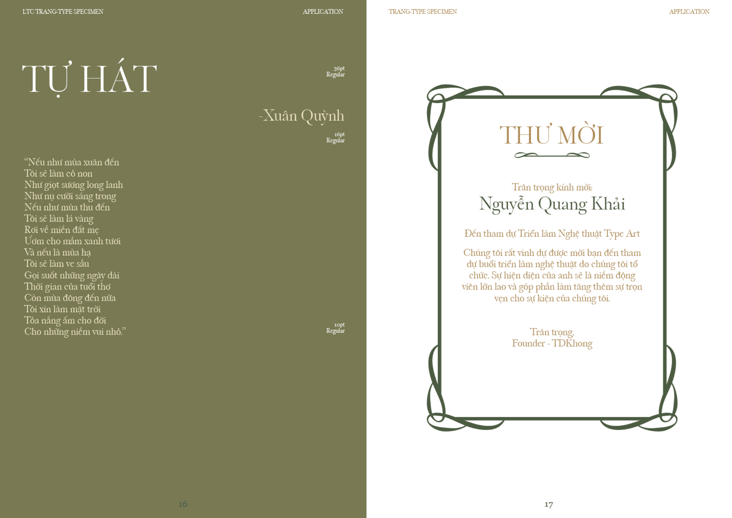 Về LTC Trang: LTC Trang thuộc dòng Old Style Serif, cắp sách học theo đại diện tiêu biểu nhất là Granjon của Linotype. LTC Trang có vóc dáng thanh mảnh, yêu kiều phù hợp cả tiêu đề và văn bản dài.