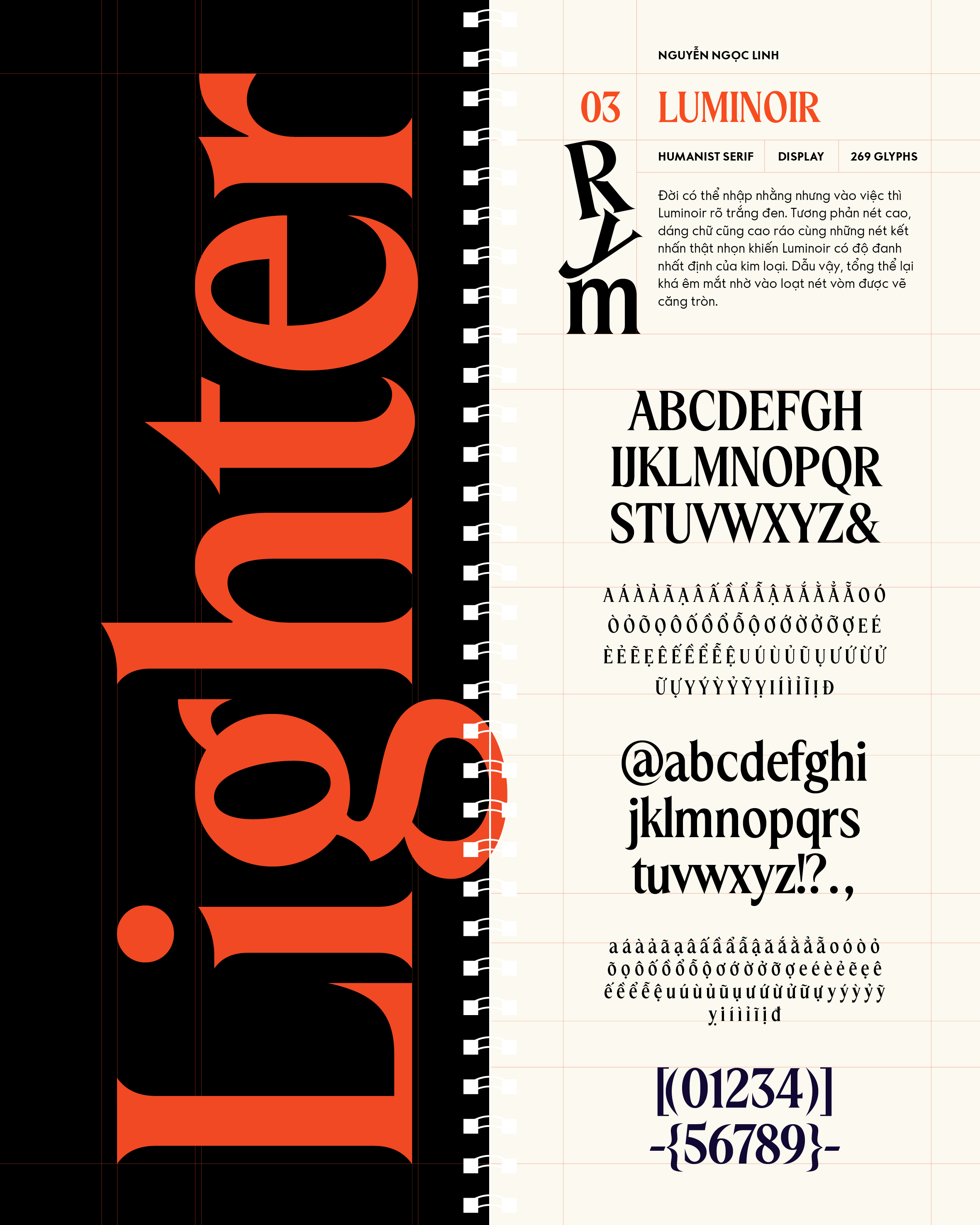 Về Luminoir: Đời có thể nhập nhằng nhưng vào việc thì Luminoir rõ trắng đen. Tương phản nét cao, dáng chữ cũng cao ráo cùng những nét kết nhấn thật nhọn khiến Luminoir có độ đanh nhất định của kim loại. Dẫu vậy, tổng thể lại khá êm mắt nhờ vào loạt nét vòm được vẽ căng tròn.