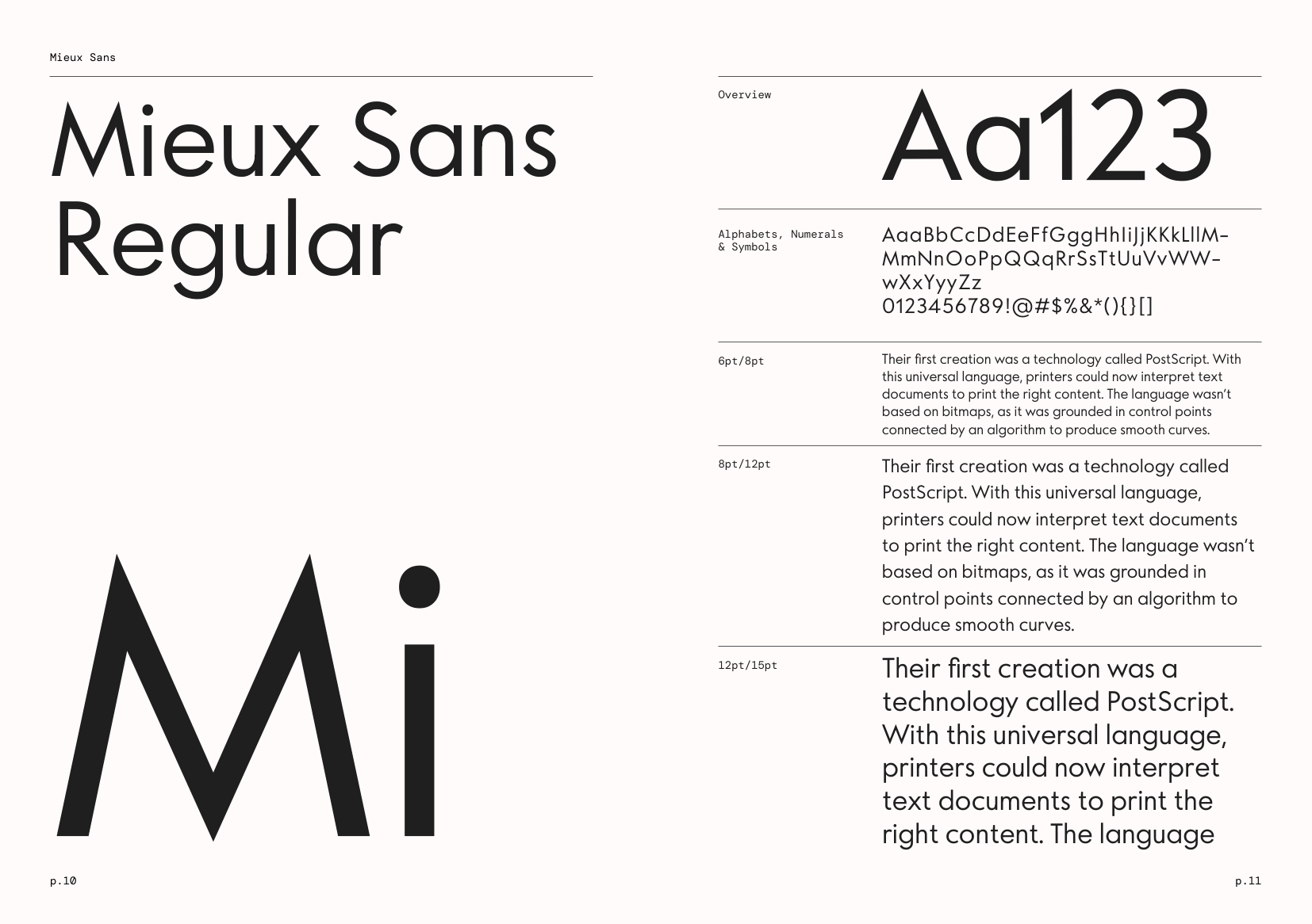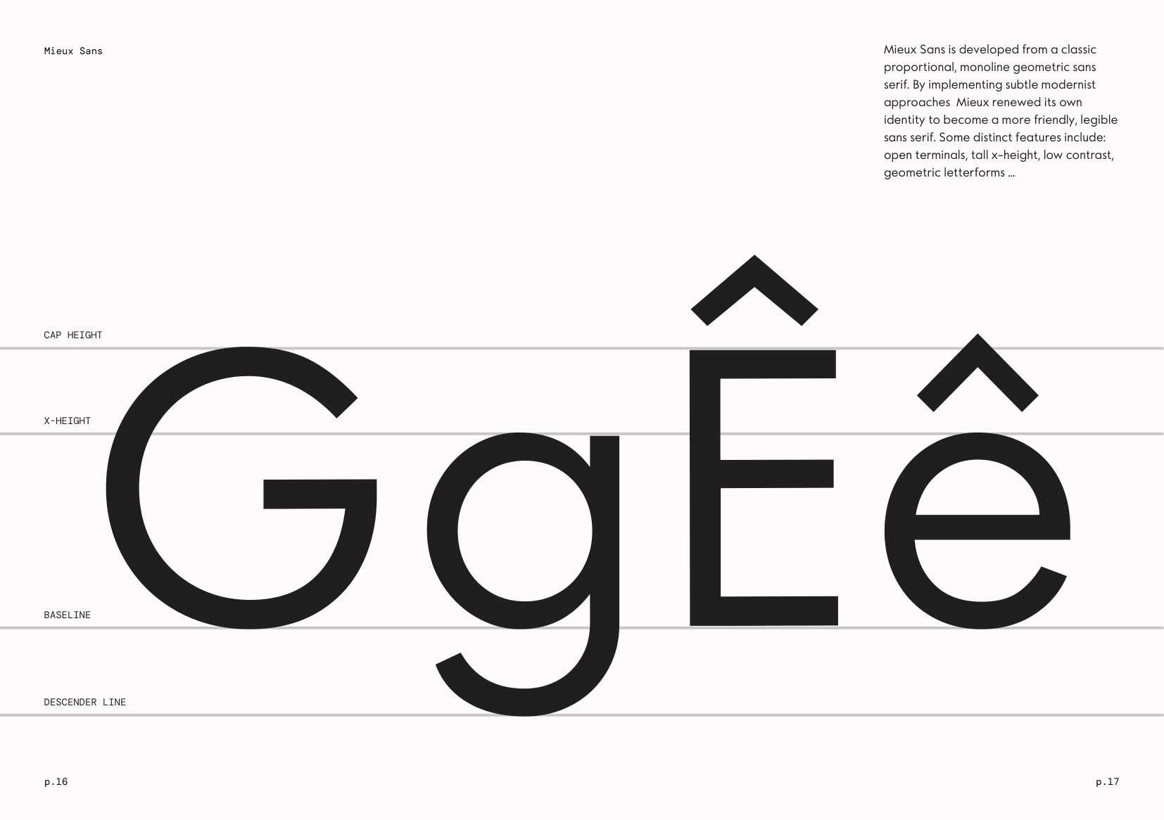 Về Mieux: Mieux là một kiểu chữ sans serif hình học, lấy cảm hứng từ Europe, một kiểu chữ được phát triển bởi xưởng đúc chữ Deberny & Peignot, lần đầu ra mắt vào năm 1937 như một phiên bản tiếng Pháp của Futura. Mieux thể hiện một hướng tiếp cận hiện đại hơn, chú trọng vào tính dễ đọc và khả năng đọc hiểu của kiểu chữ sans serif hình học, cũng như khả năng thích ứng với kỷ nguyên kỹ thuật số ngày nay.