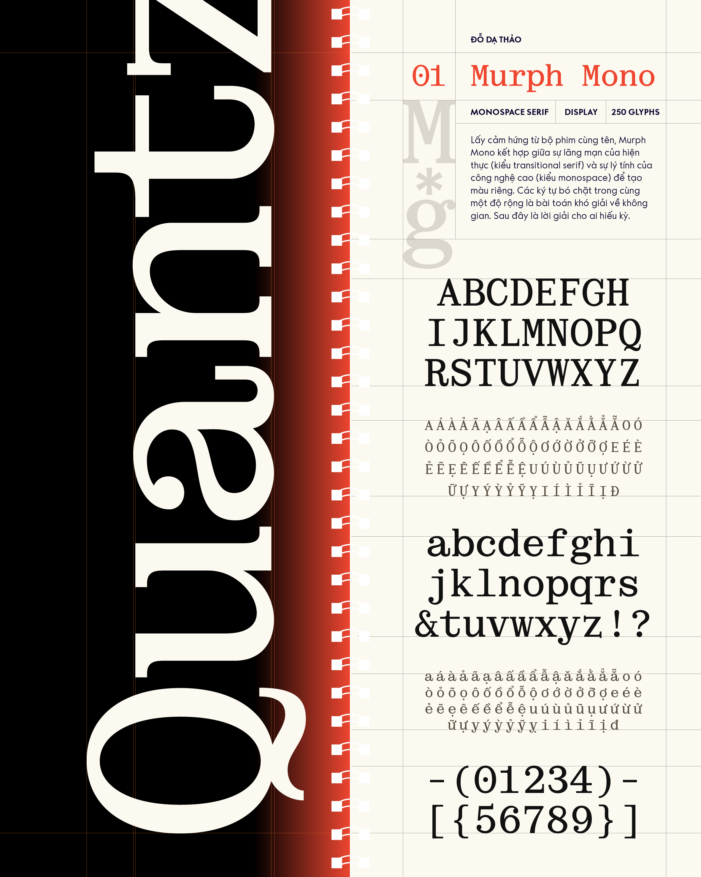 Về Murph Mono: Lấy cảm hứng từ bộ phim cùng tên, Murph Mono kết hợp giữa sự lãng mạn của hiện thực (kiểu transitional serif) và sự lý tính của công nghệ cao (kiểu monospace) để tạo màu riêng. Các ký tự bó chặt trong cùng một độ rộng là bài toán khó giải về không gian. Sau đây là lời giải cho ai hiếu kỳ.