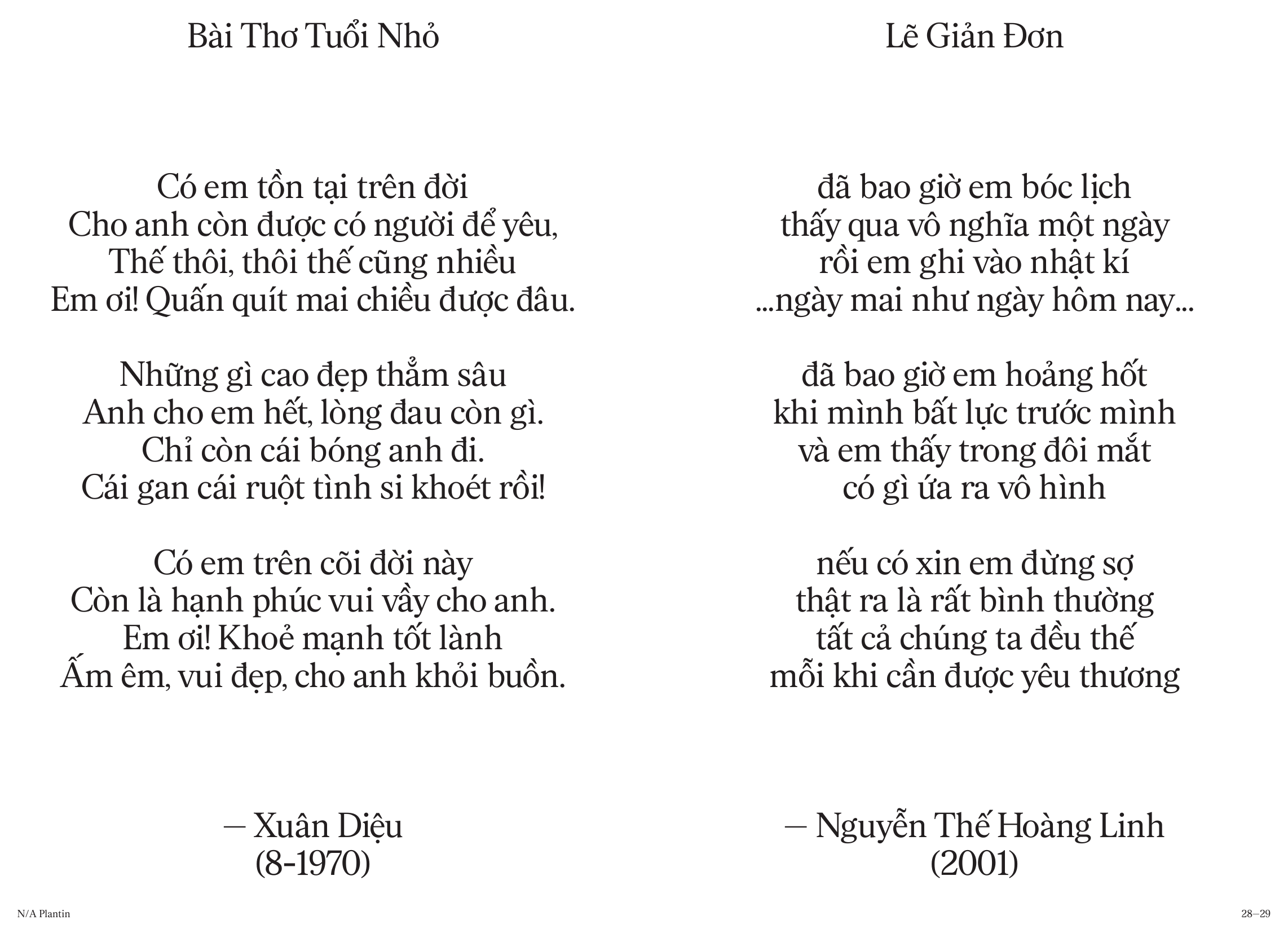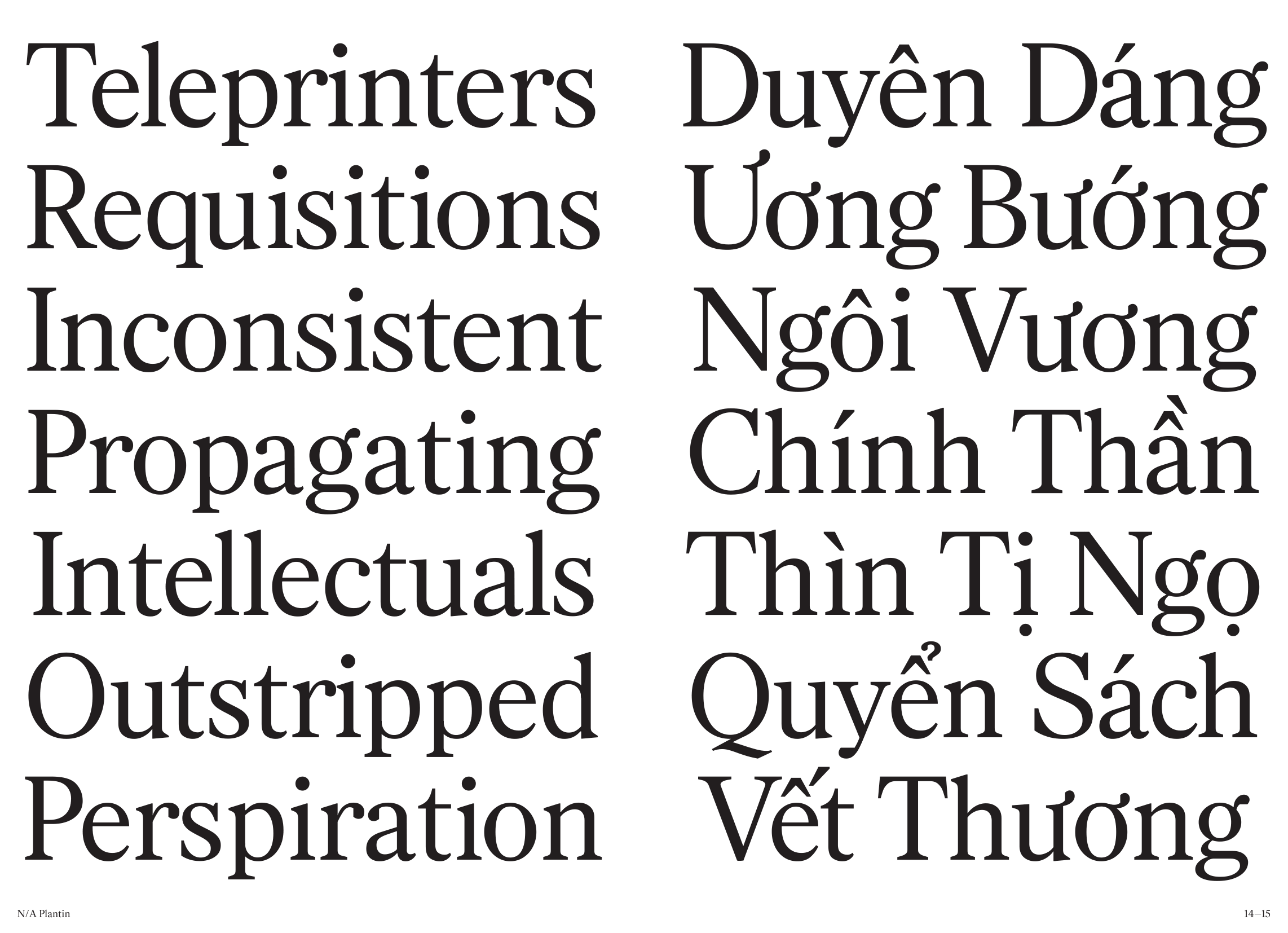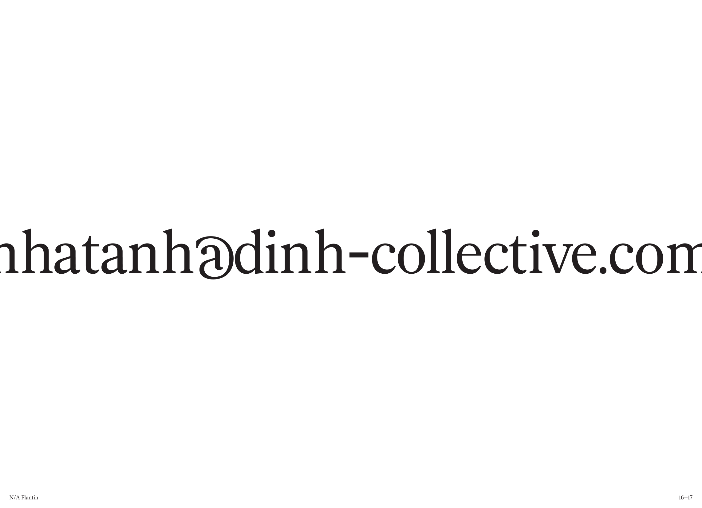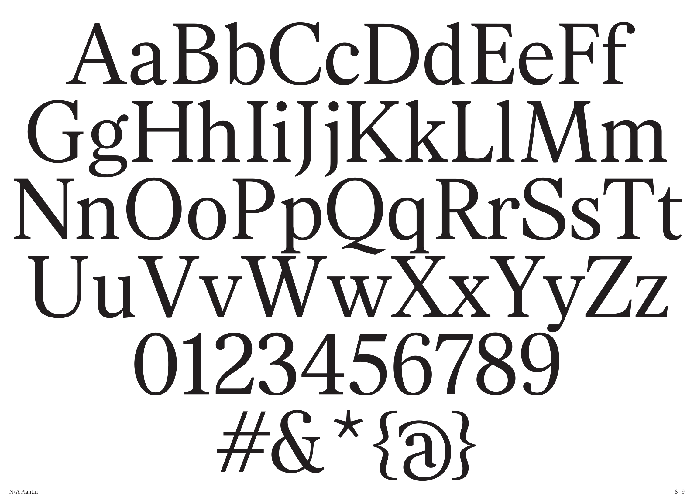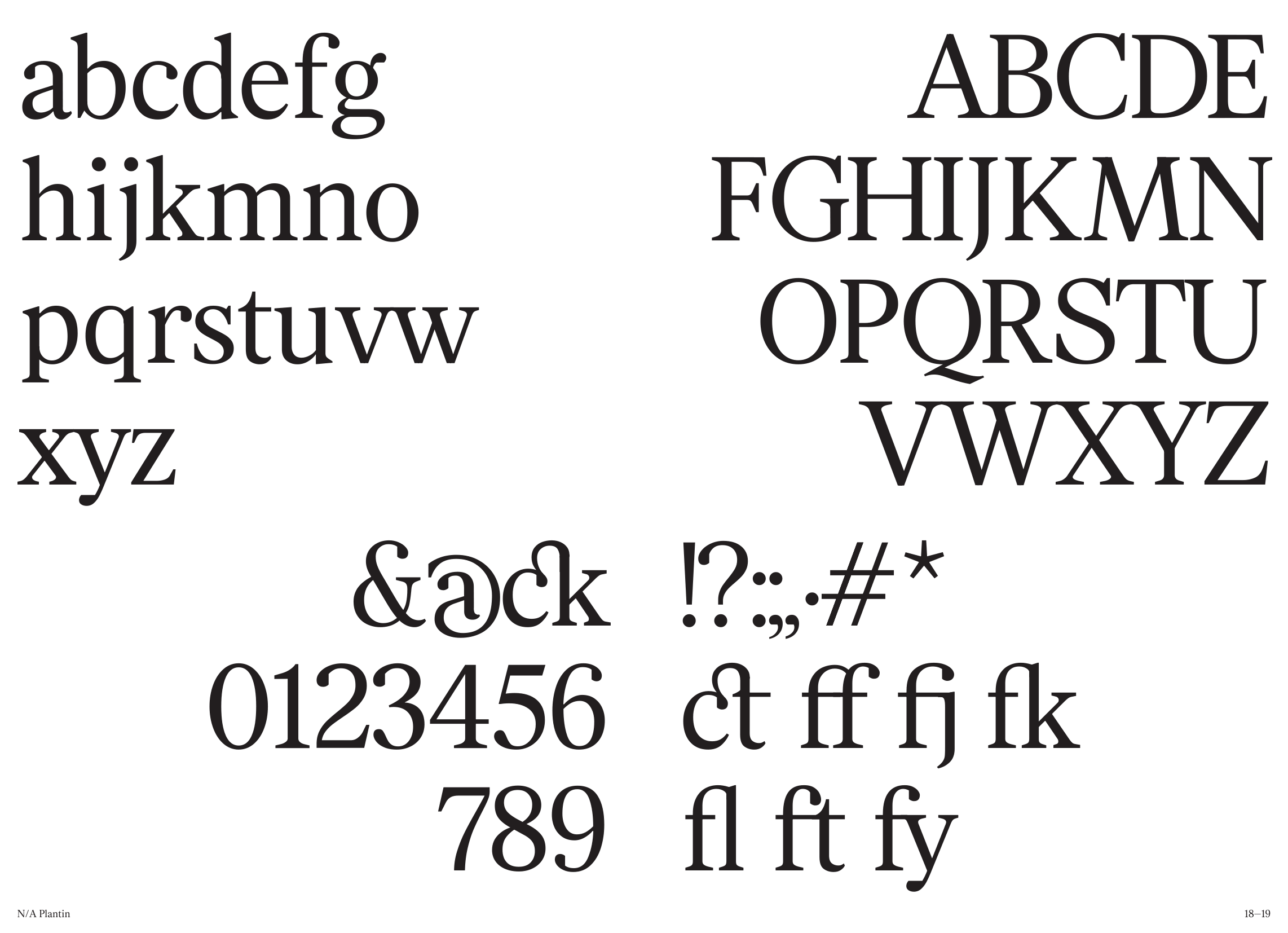 Về NA Plantin: Đây là Plantin Antiqua (thiết kế bởi xưởng đúc Genzsch và Heyse), được phát triển theo một hướng đi mới. Thoạt nhìn, N/A Plantin có vẻ gần giống với các kiểu Transitional Serif đương đại: tỷ lệ khá cao và khoảng cách giữa các ký tự tương đối đều. Bản sắc của N/A Plantin nằm ở cách tiếp cận hiện đại trong các chi tiết như giọt chữ được cắt gọn và sự chuyển tiếp mượt mà từ thân chữ sang chân serif.