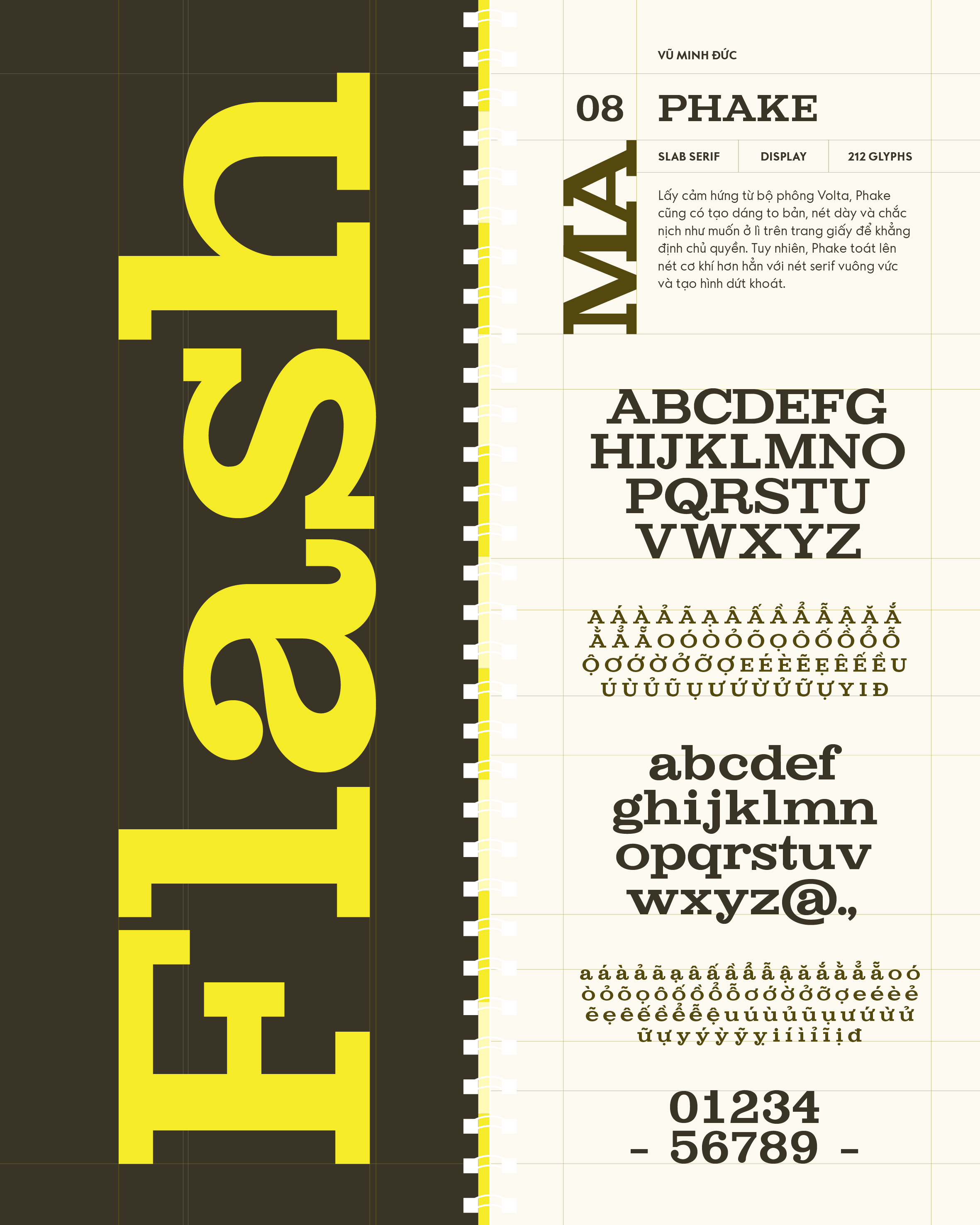 Về Phake: Lấy cảm hứng từ bộ phông Volta, Phake cũng có tạo dáng to bản, nét dày và chắc nịch như muốn ở lì trên trang giấy để khẳng định chủ quyền. Tuy nhiên, Phake toát lên nét cơ khí hơn hẳn với nét serif vuông vức và tạo hình dứt khoát.