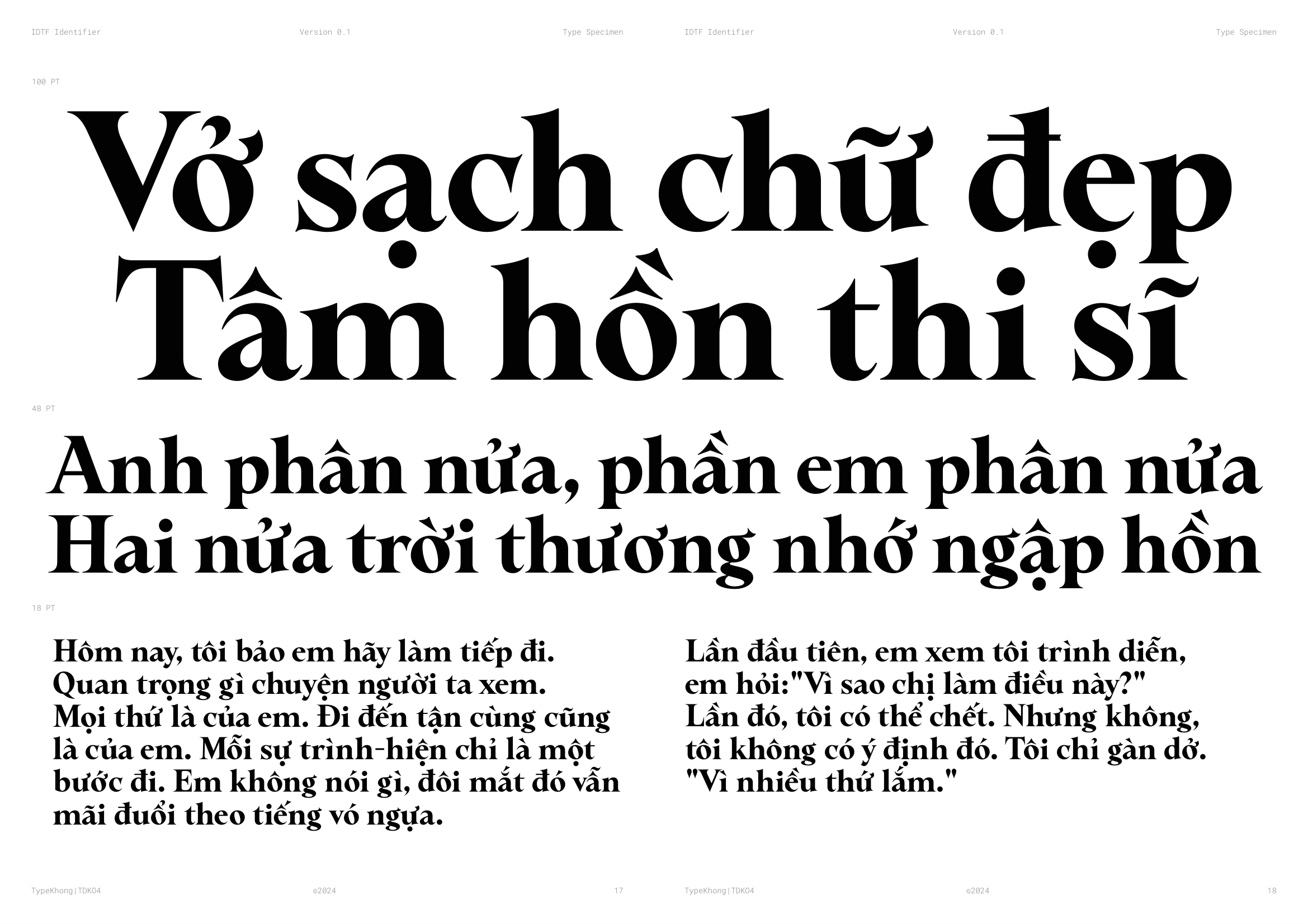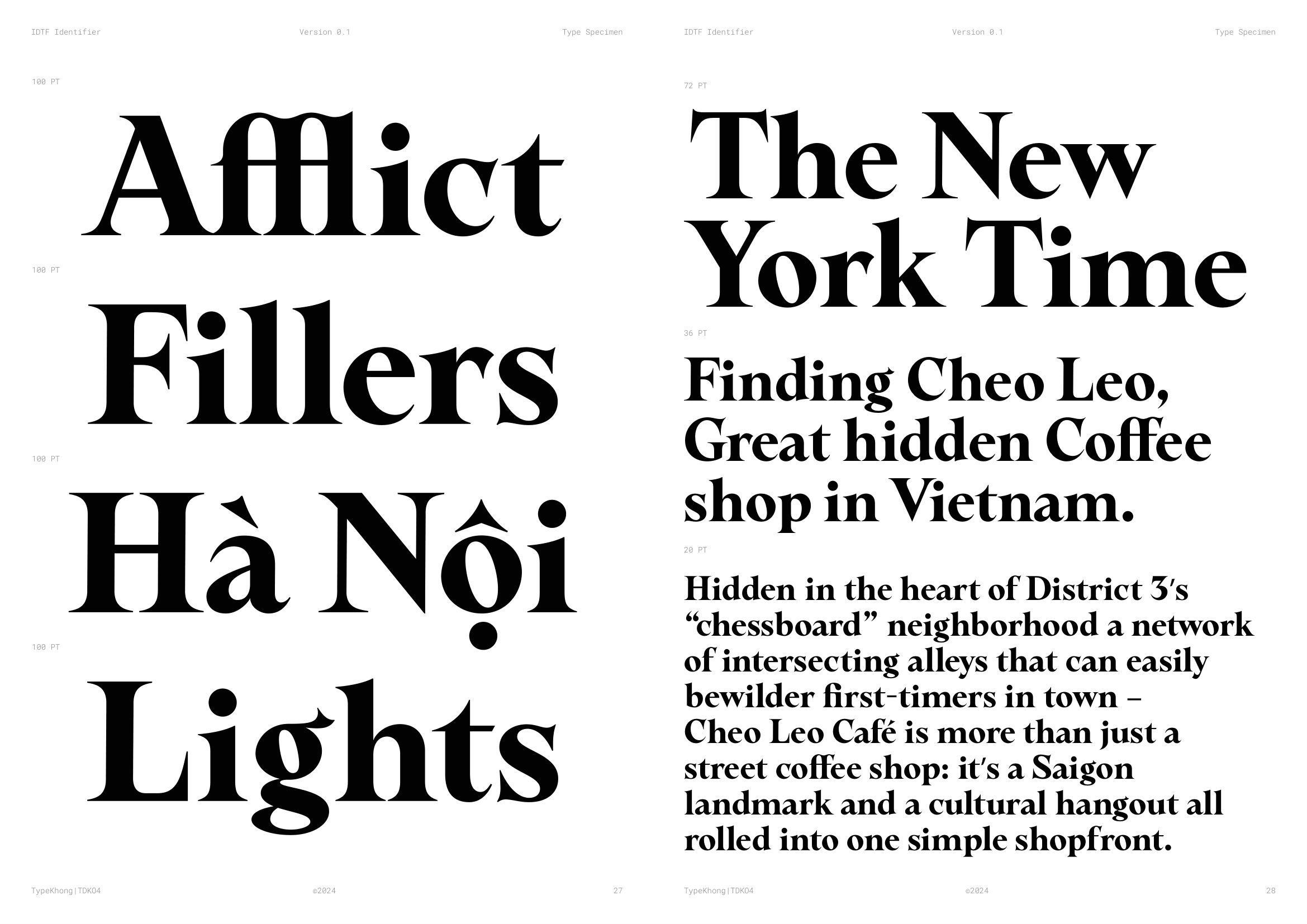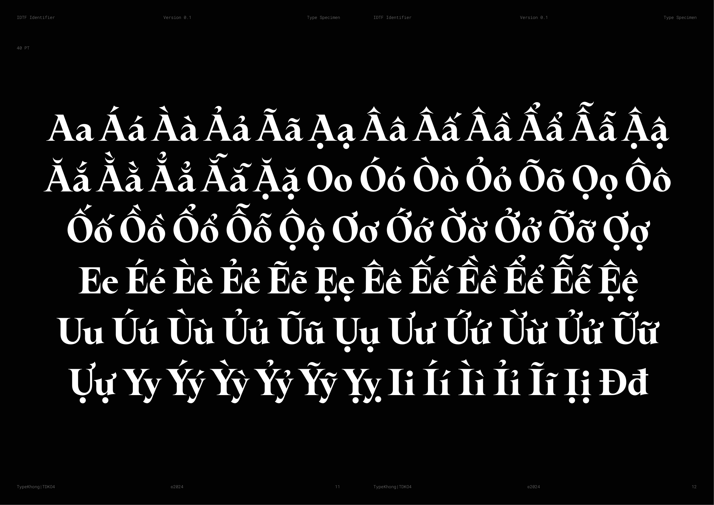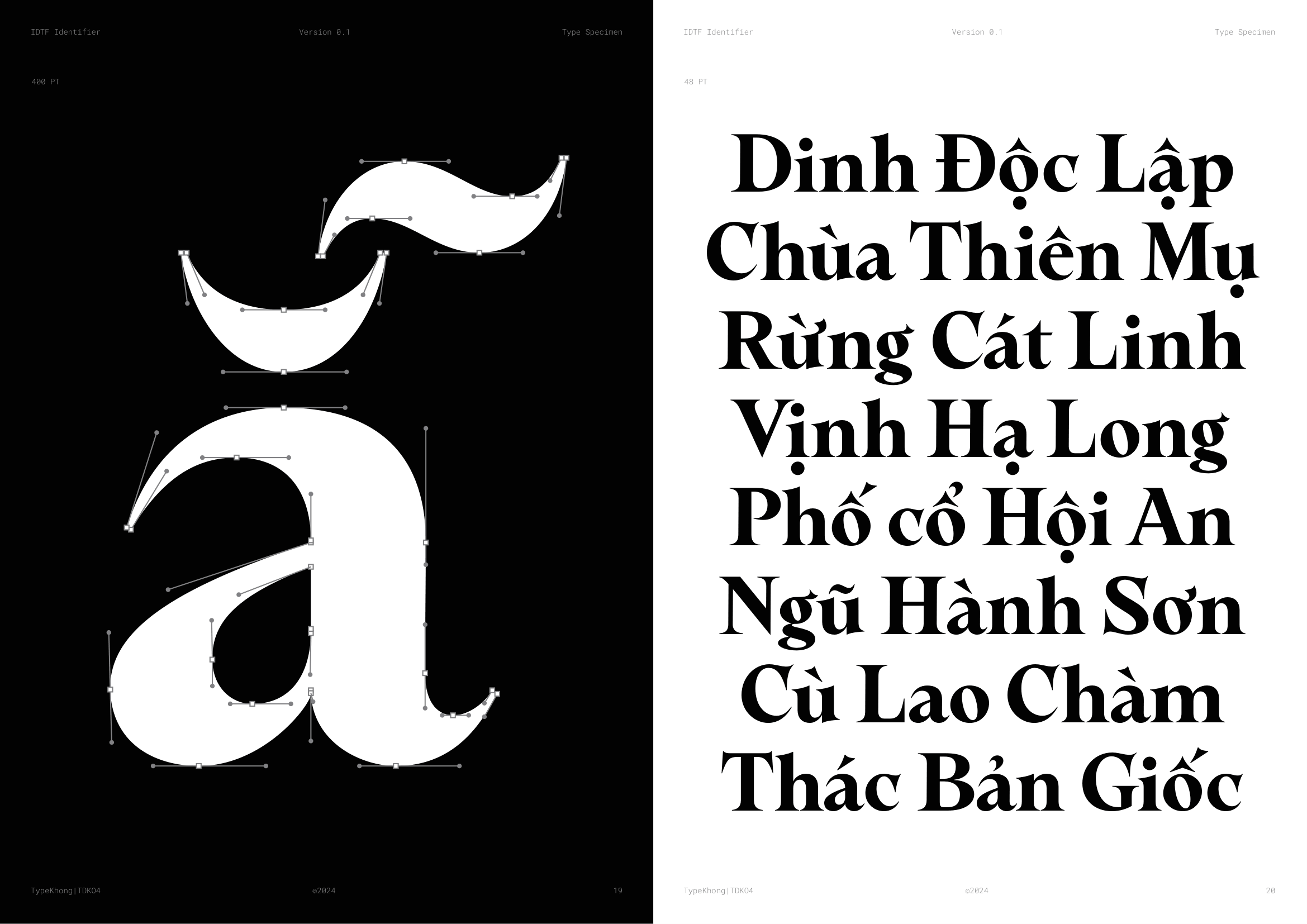 Về PKT Identifier: Identifier là một kiểu chữ phục dựng từ Laureate Bold, dòng transitional serif với dáng serif như ống loe. Laureate được khắc lần đầu bởi Keystone Type Foundry tại Philadelphia, PA, vào đầu những năm 1900, dùng cho các tiêu đề khổ lớn. Lấy cảm hứng từ những tiêu đề serif đậm, chặt chẽ của thời đại phóng khoáng ấy, Identifier ra đời với mục đích phục dựng bộ chữ, tinh chỉnh các nét, khắc phục những điểm yếu của font cũ. Sau đó bổ sung đầy đủ bộ dấu tiếng Việt theo cách sắc nét và nổi bật hơn.