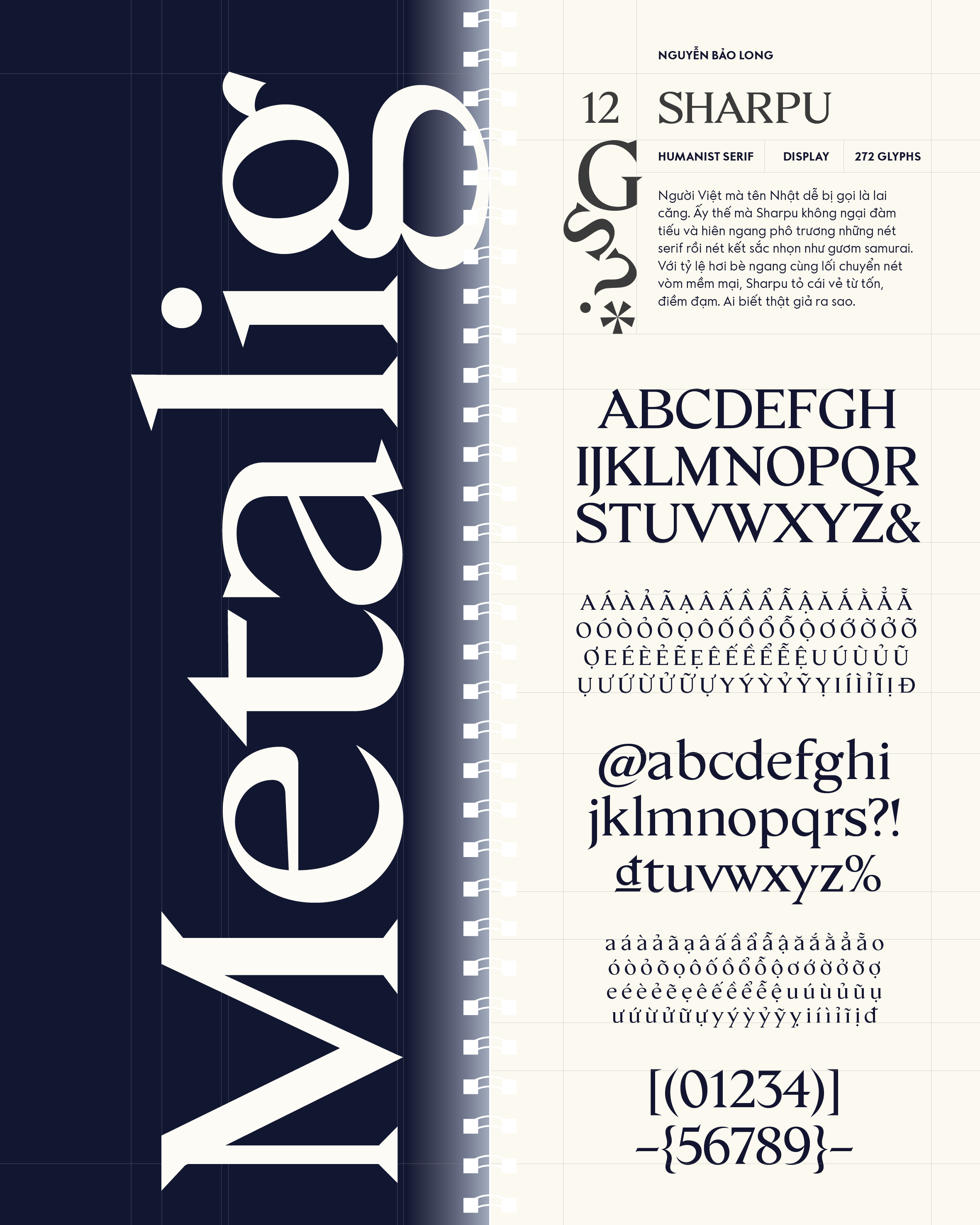 Về Sharpu: Người Việt mà tên Nhật dễ bị gọi là lai căng. Ấy thế mà Sharpu không ngại đàm tiếu và hiên ngang phô trương những nét serif rồi nét kết sắc nhọn như gươm samurai. Với tỷ lệ hơi bè ngang cùng lối chuyển nét vòm mềm mại, Sharpu tỏ cái vẻ từ tốn, điềm đạm. Ai biết thật giả ra sao.