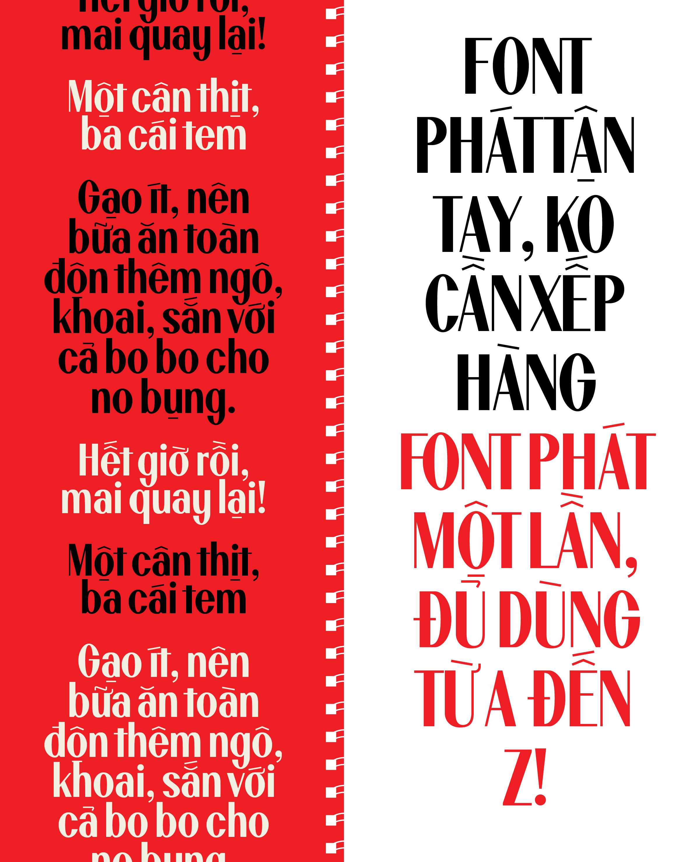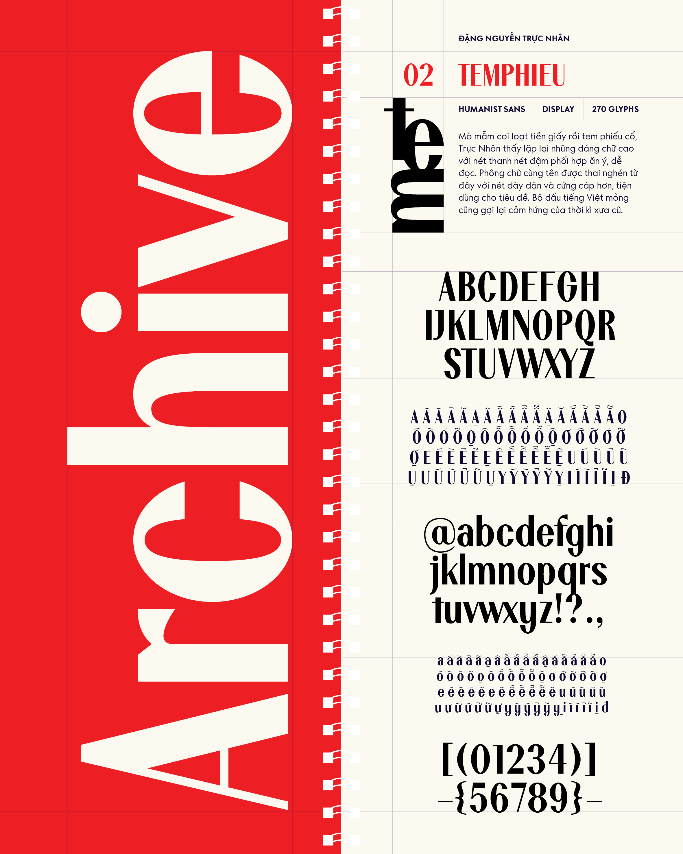 Về Temphieu: Mò mẫm coi loạt tiền giấy rồi tem phiếu cổ, Trực Nhân thấy lặp lại những dáng chữ cao với nét thanh nét đậm phối hợp ăn ý, dễ đọc. Phông chữ cùng tên được thai nghén từ đây với nét dày dặn và cứng cáp hơn, tiện dùng cho tiêu đề. Bộ dấu tiếng Việt mỏng cũng gợi lại cảm hứng của thời kì xưa cũ.