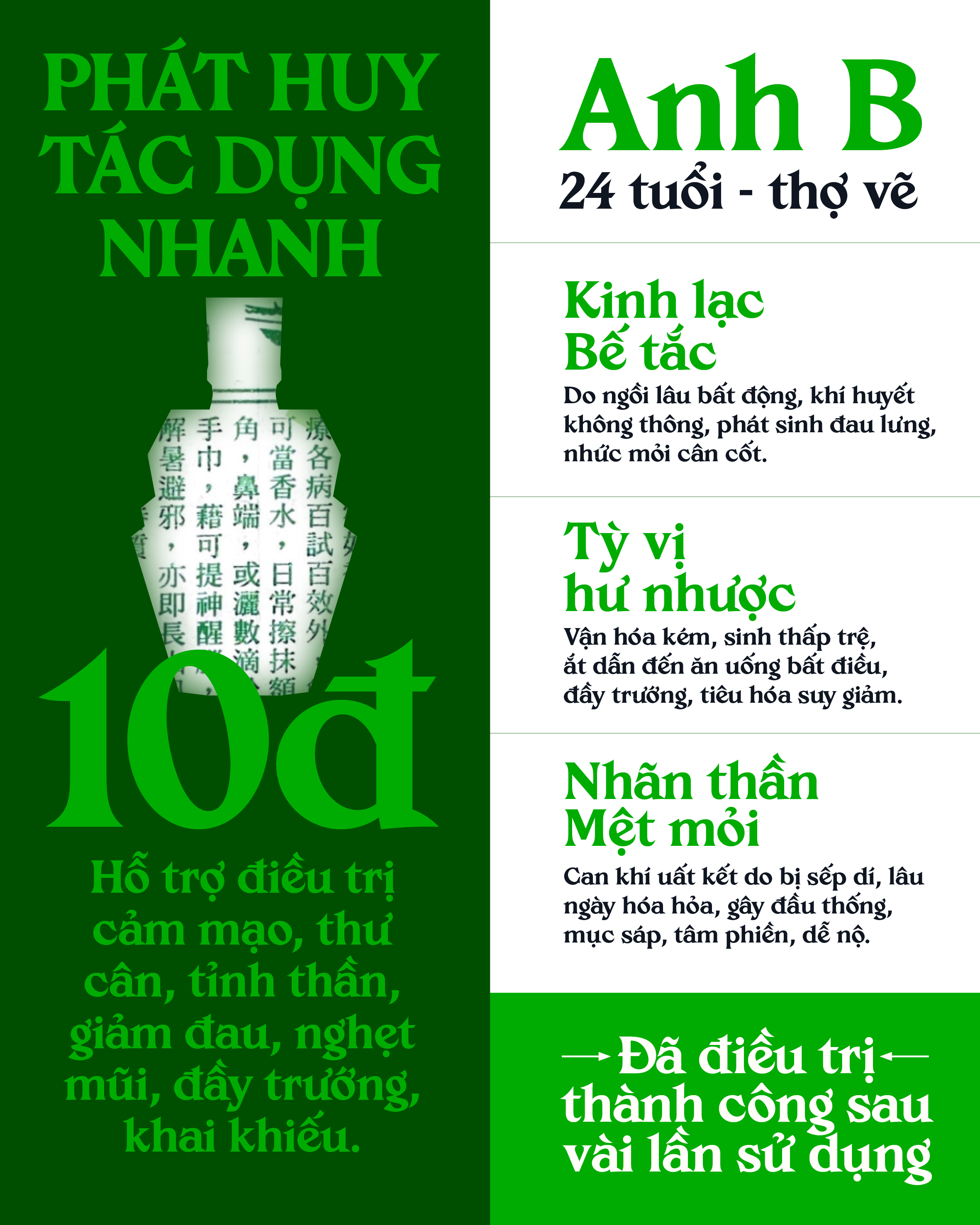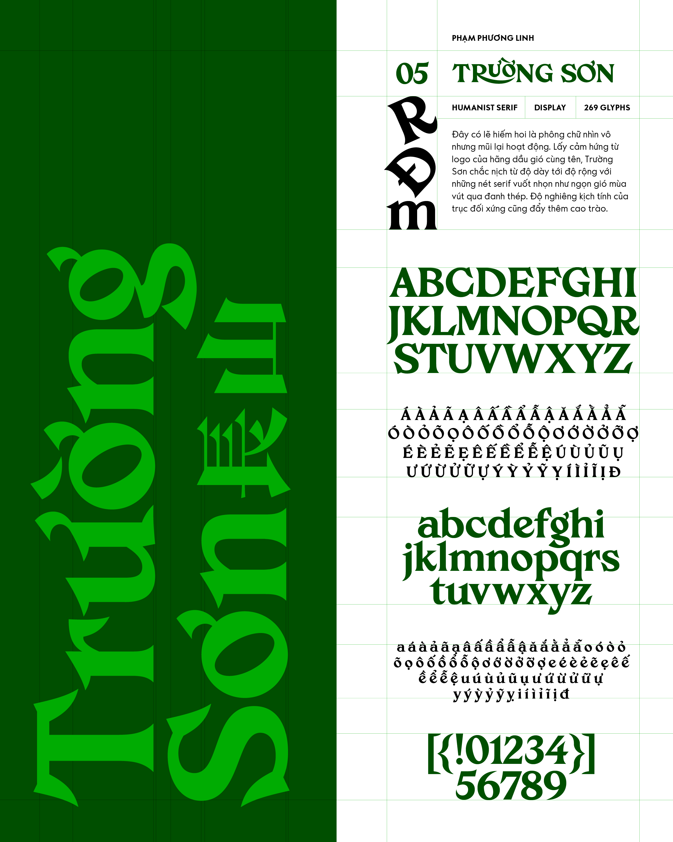 Về Trường Sơn: Đây có lẽ hiếm hoi là phông chữ nhìn vô nhưng mũi lại hoạt động. Lấy cảm hứng từ logo của hãng dầu gió cùng tên, Trường Sơn chắc nịch từ độ dày tới độ rộng với những nét serif vuốt nhọn như ngọn gió mùa vút qua đanh thép. Độ nghiêng kịch tính của trục đối xứng cũng đẩy thêm cao trào.