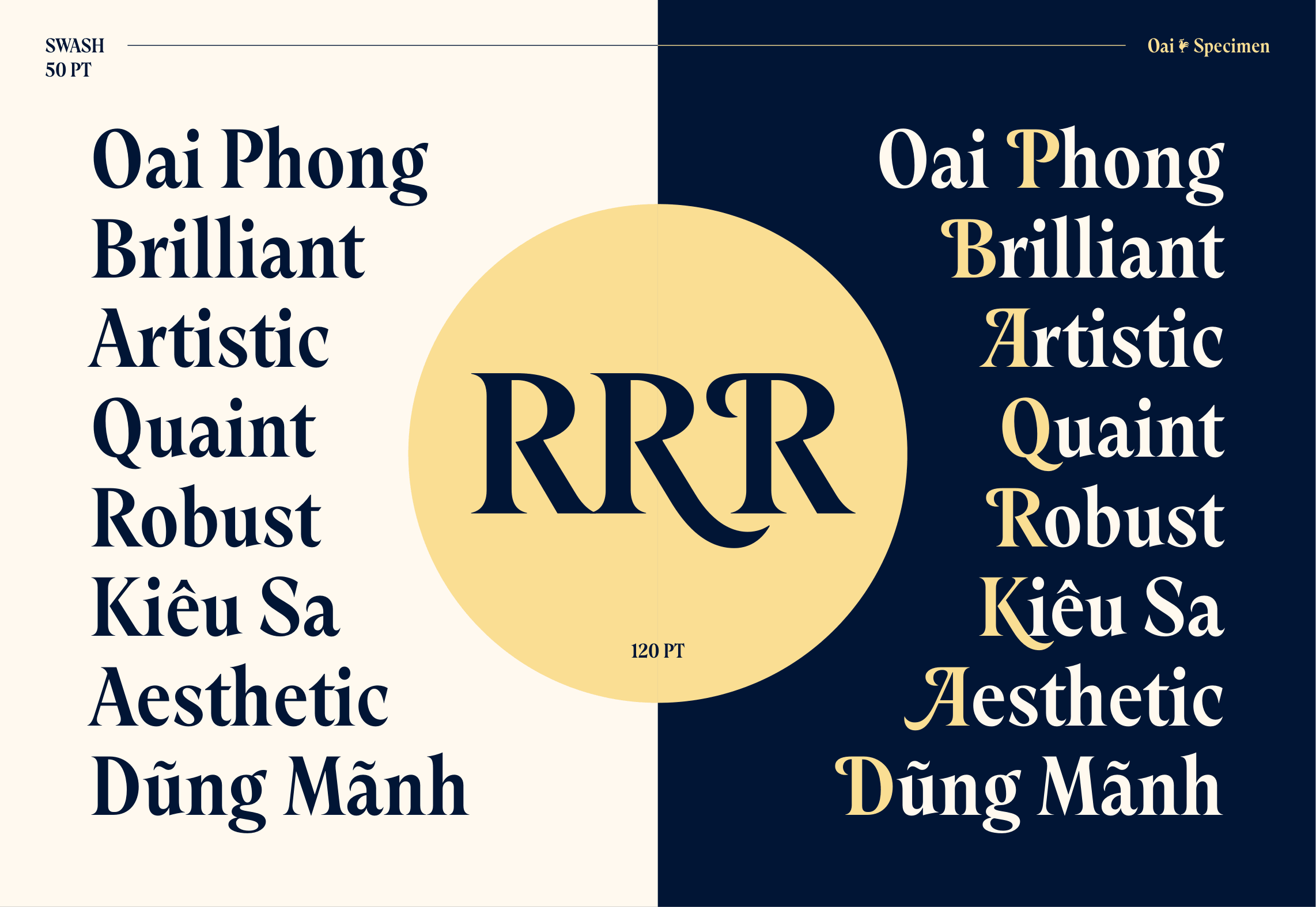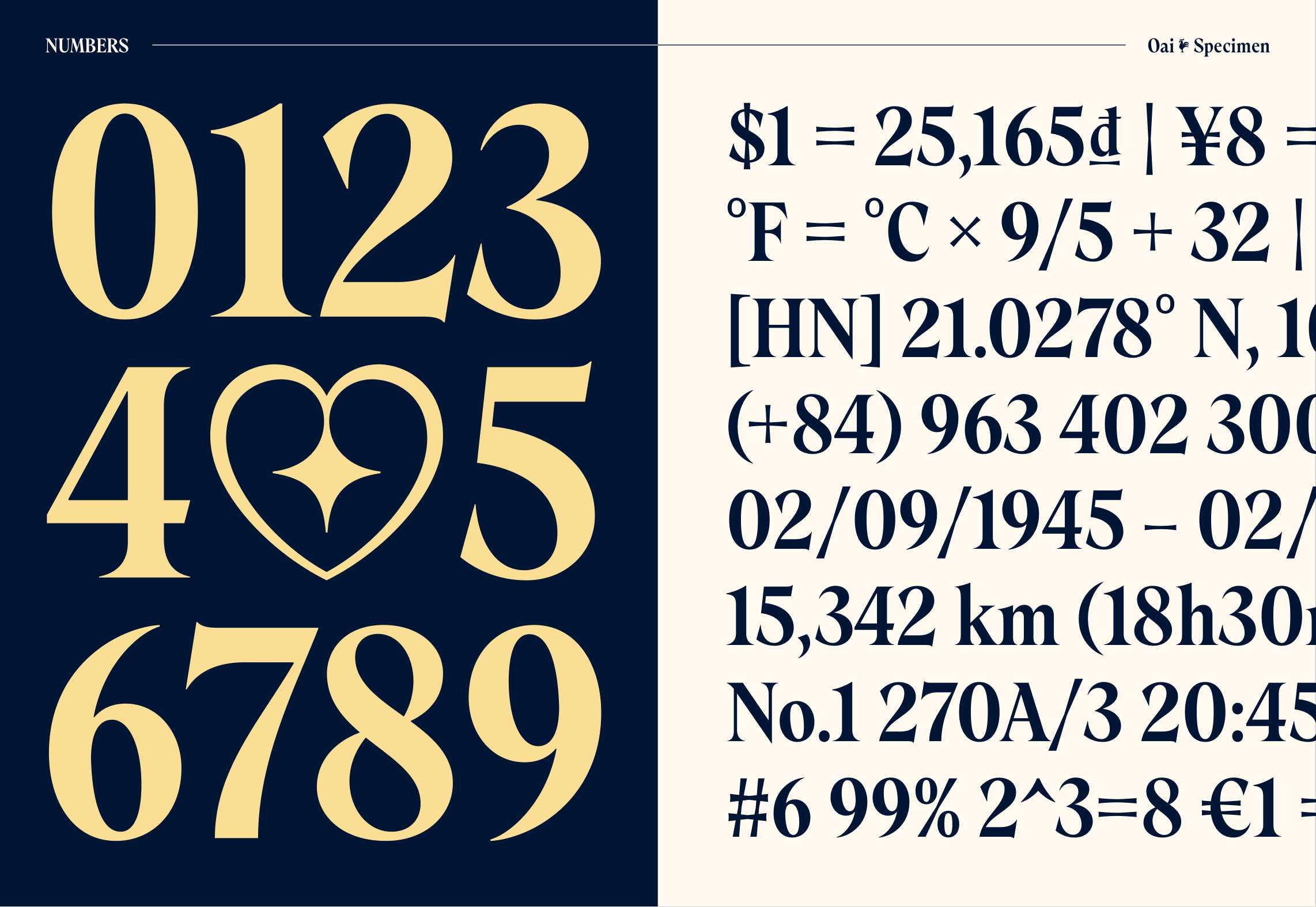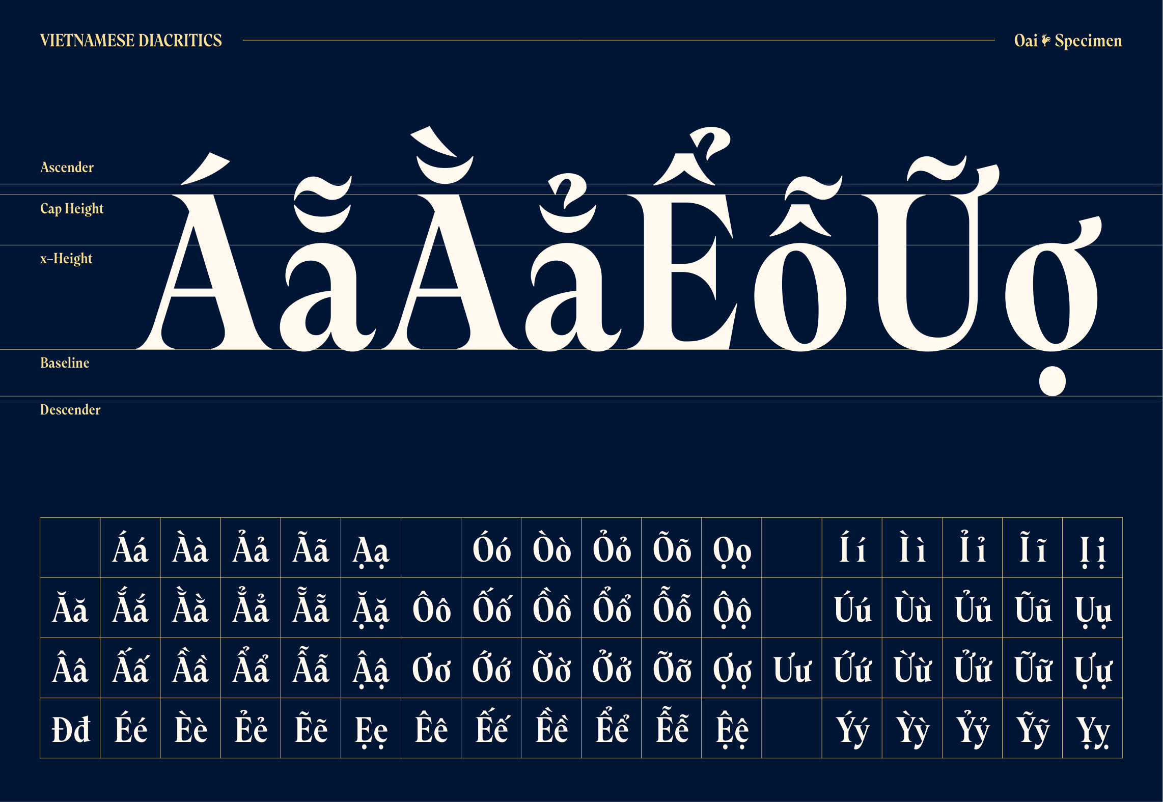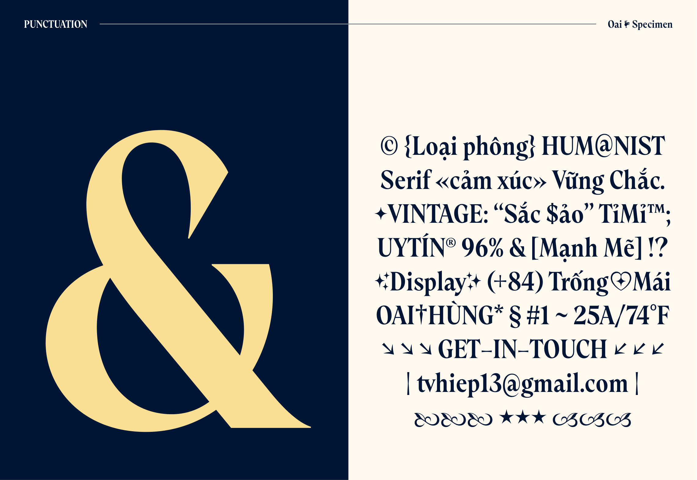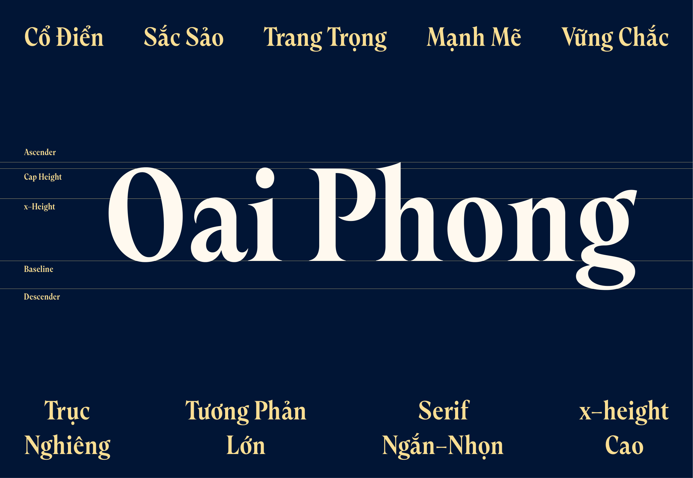 Về TVH Oai Display: OAI là kiểu chữ serif display mang tinh thần humanist, lấy cảm hứng từ Laureate — một kiểu chữ được phát triển bởi Keystone Type Foundry tại Philadelphia vào năm 1901. Nổi bật với thiết kế serif loe, chắc khỏe cùng độ mở không gian âm lớn, Laureate chủ yếu được sử dụng cho tiêu đề và các dòng chữ lớn.